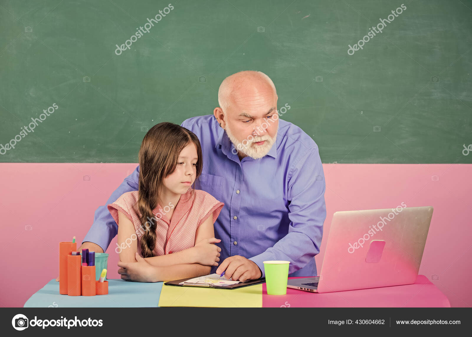 Making Lives Better Senior Teacher Help School Girl Small Girl With Man Tutor Study On Laptop Online Education Back To School Modern Technology In Learning School Shopping Writing An Essay Stock Photo